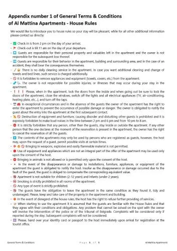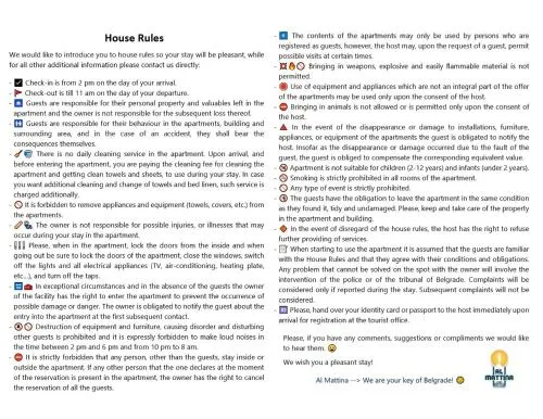 | Bezbednost | Dostupan je pribor za prvu pomoć, Sredstvo za dezinfekciju ruku u jedinici i zajedničkim prostorijama, Uklonjeni su predmeti za zajedničku upotrebu poput štampanih menija, časopisa, olovaka i papira, Osoblje se pridržava svih sigurnosnih protokola koje propisuju lokalni organi vlasti |