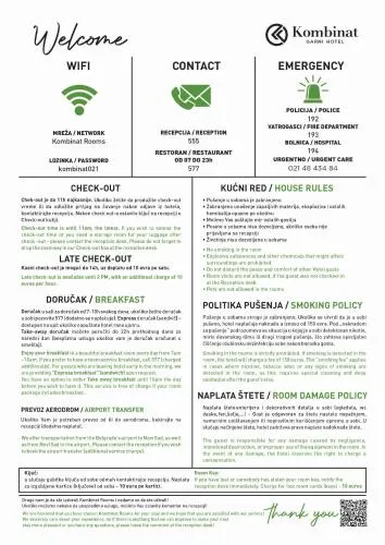 | Bezbednost | Uveden je postupak za proveru zdravstvenog stanja gostiju, Dostupan je pribor za prvu pomoć, Sredstvo za dezinfekciju ruku u jedinici i zajedničkim prostorijama, Uklonjeni su predmeti za zajedničku upotrebu poput štampanih menija, časopisa, olovaka i papira, Osoblje se pridržava svih sigurnosnih protokola koje propisuju lokalni organi vlasti |