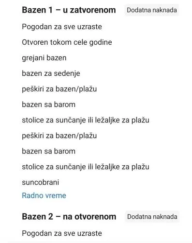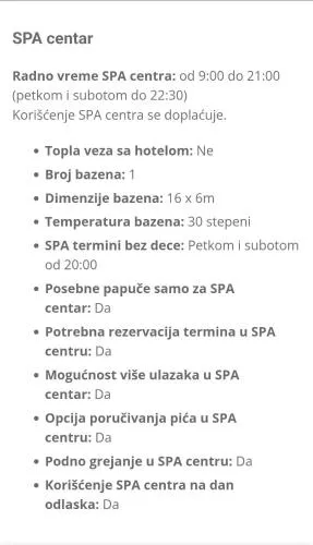 | Bazen i velnes | masaža celog tela, spa centar na otvorenom, otvoreni bazen (sezonski), zatvoreni bazen (tokom čitave godine), bazen, bazen, dečji bazen, svlačionice u fitnes/spa sadržajima, fitnes, parno kupatilo, masaža leđa, grejani bazen, bazen za sedenje, bazen sa barom, spa i velnes paketi, soba za relaksaciju, stolice za sunčanje ili ležaljke za plažu, suncobrani, spa sadržaji, masaža, otvoreni bazen, zatvoreni bazen, hidromasažna kada/đakuzi, sauna, fitnes centar, spa i velnes centar, tursko/parno kupatilo |